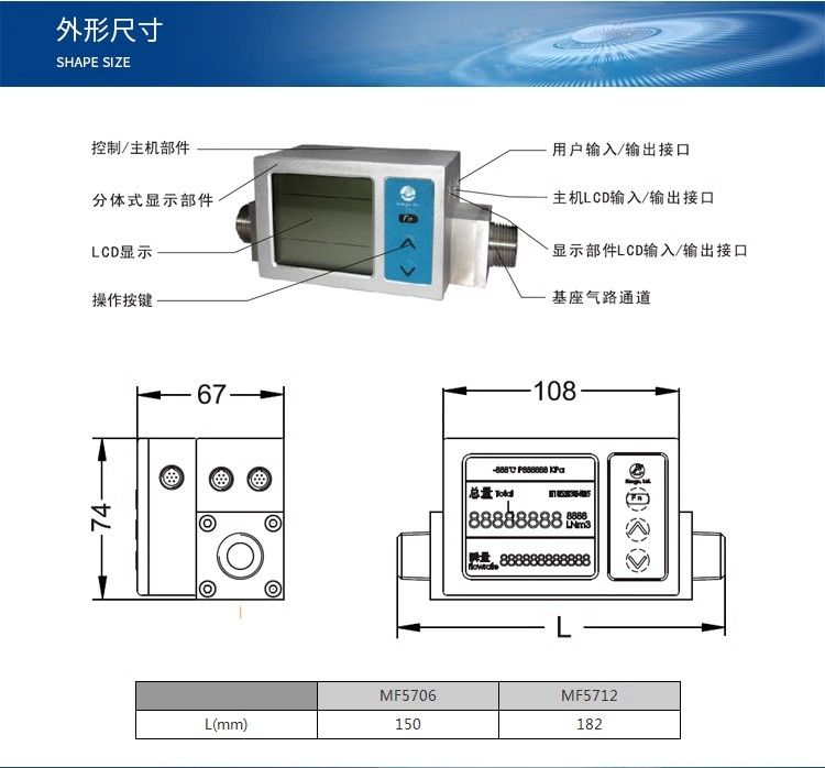 MF5619气体流量计-分体式显示器可通过经特殊设计的连接电缆安装于远离气体管路的地方