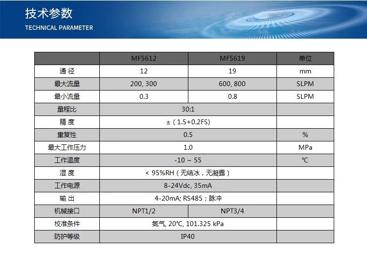 MF5612气体质量流量计产品特点:MF5612 MF5619 单位 通径 12 19 mm *大流量 200, 300 600, 800 SLPM *小流量 0.3 0.8 SLPM 量程比 100:1 精度 1.5级 重复性 ±0.75 % *大工作压力 1.0 MPa 工作温度 -10 ~ 55 oC 湿度 < 95%RH(无结冰,无凝露) 工作电源 8-24Vdc, 35mA 输出 4-20mA; RS485;脉冲 机械接口 NPT, BSPT可根据用户需要定制 校准条件 空气, 20oC, 101.325 kPa -